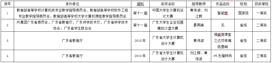 中心教职员工在指导我校学生参加大学生创新创业训练项目(以下简称大创项目)以及参加专业竞赛方面也全面开花、硕果累累。2018年中心成功立项校级大创项目4项,顺利通过验收大创项目3项。其中潘星老师指导的大创项目——《高校网站群创业实训基地》名列前茅,获得了2018年国家级大创项目立项。专业竞赛方面,黄伟波和刘江辉两位老师带领的学生团队在第十一届中国大学生计算机设计大赛中力压群雄,获得全国一等奖的优秀成绩!晏再庚老师带领的学生代表团队参加广东大学生企业经营模拟沙盘大赛,荣获二等奖,并顺利晋级全国比赛。各指导老师悉心指导,循循善诱,带领学生屡创佳绩,获得师生一致好评。