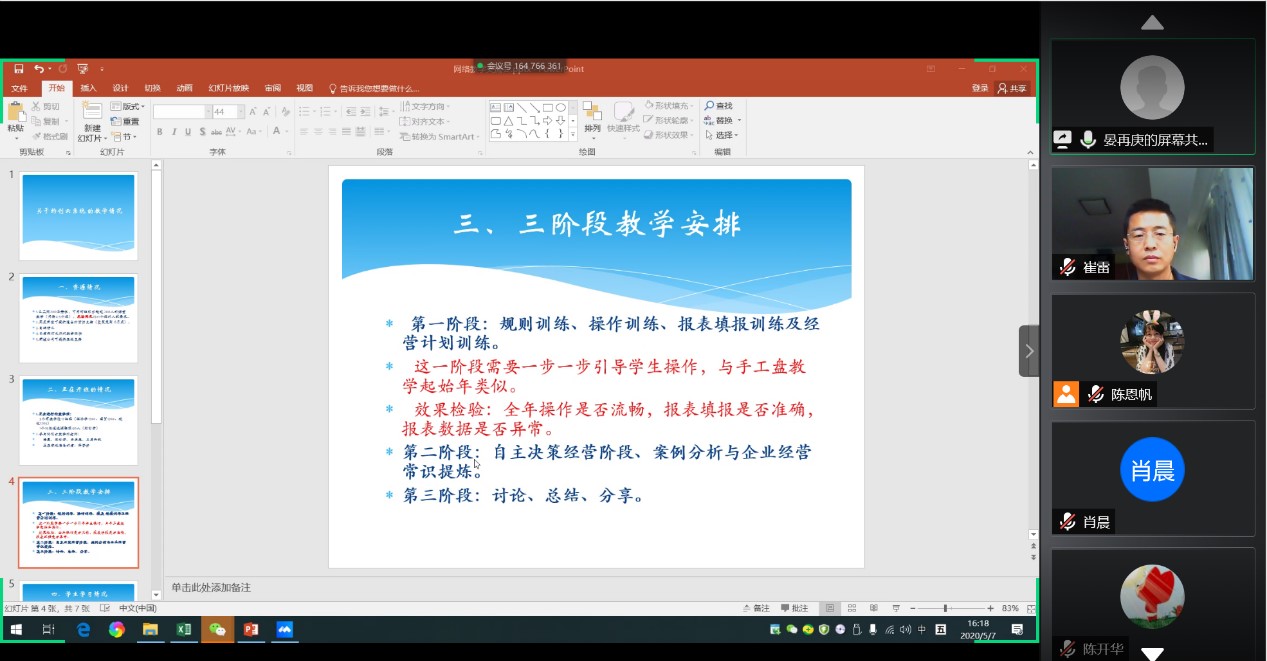 5月7日下午,实验教学中心利用“腾讯会议”线上举行“在线教学研讨会”,中心主任谢建国、党总支部书记范正华,以及《企业资源计划(ERP)》和《企业行为模拟(校内实习)》课程全体主讲教师参加会议。会议由经管法实验教学部主任崔雷主持。
